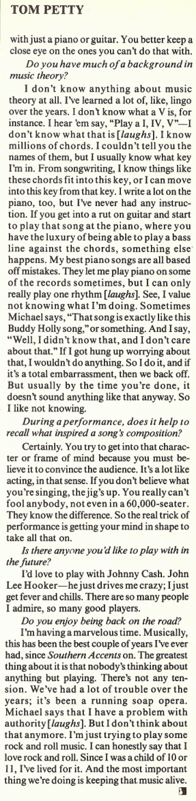 I'm having a marvelous time. Musicialy, this is the best couple of years I've ever had, since Southern Accents on. The greatest thing about it is that nobody's thinking about anything but playing. There's not any tension. We've had a lot of trouble over the years; it's been a running soap opera. Michael says that I have a problem with authority [laughs]. But I don't think about that anymore. I'm just trying to play some rock and roll music. I can honestly say that I love rock and roll. Since I was a child of 10 or 11, I've lived for it. And the most important thing we're doing is keeping that music alive.