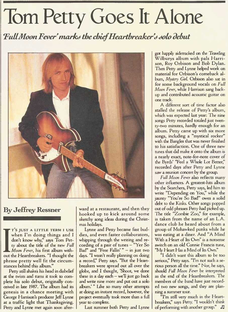 Last summer both Petty and Lynne got happily sidetracked on the Traveling Wilburys album with pals Harrison, Roy Orbison, and Bob Dylan. Then Petty and Lynne helped work on material for Orbison's comeback album, Mystery Girl. Orbison also sat in for some background vocals on Full Moon Fever, while Harrison sang backup and contributed acoustic guitar on one track.