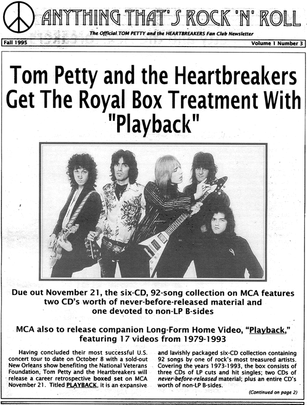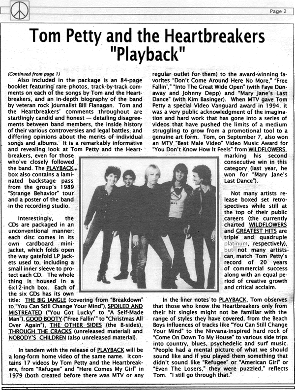 Having concluded their most successful U.S. concert tour to date on October 8 with a sold-out New Orleans show benefiting the National Veterans Foundation, Tom Petty and the Heartbreakers will release a career retrospective boxed set on MCA November 21. Titled PLAYBACK, it is an expansive and lavishly packaged six-CD collection containing 92 songs by one of rock's most treasured artists. Covering the years 1973-1993, the box consists of three CDs of LP cuts and hit singles; two CDs of never-before-released material; plus an entire CD's worth of non-LP B-sides.
