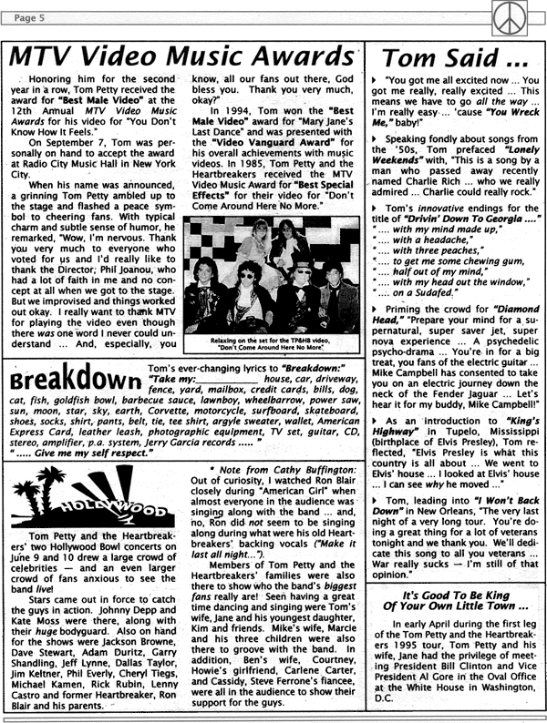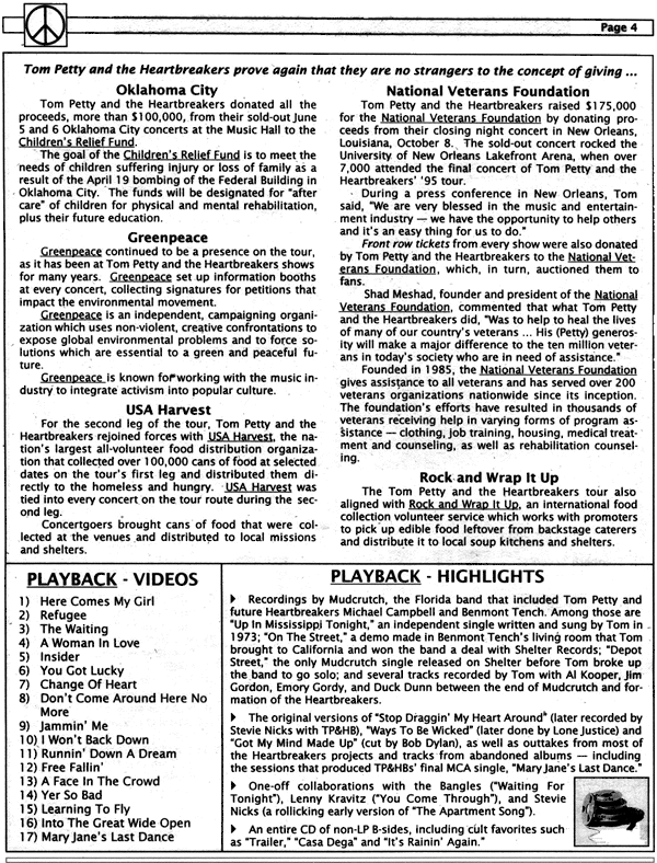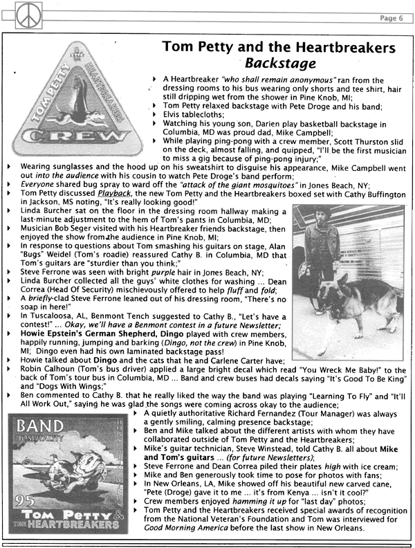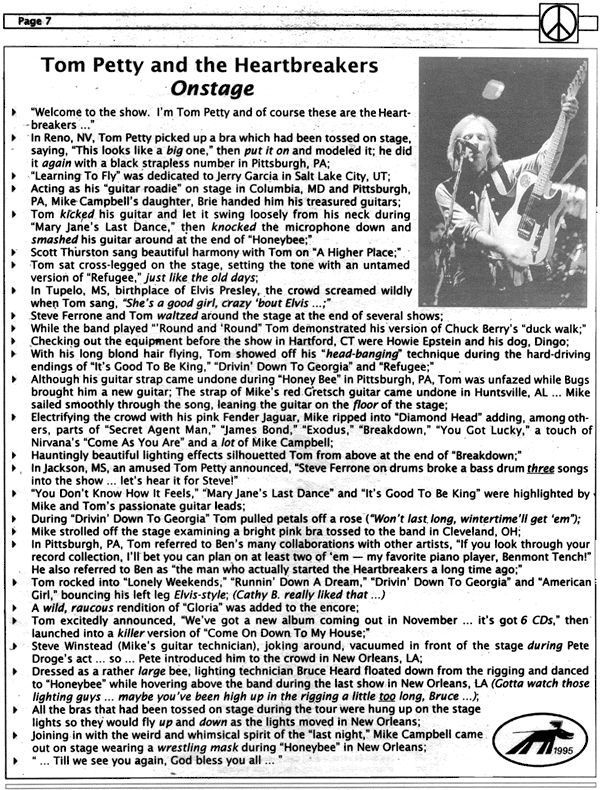 ... The 1995 tour is over ... it was so wonderful ... I went to 29 amazing shows in 17 states this tour, and now I'm definitely going through TP&HB withdrawal ... To quote a friend of ours, "Too much ain't enough!" In this issue on of the newsletter I've mentioned more backstage and onstage antics ... In future issues I'll go into other details about the last show, Mike and Tom's guitars, something special about Ben, etc.