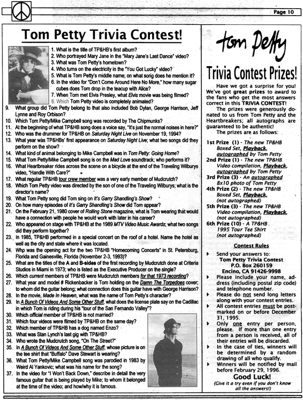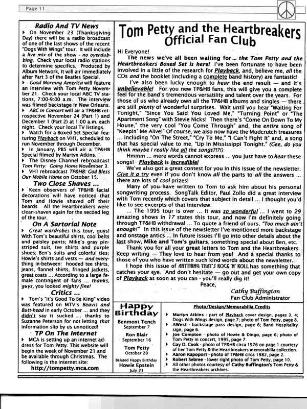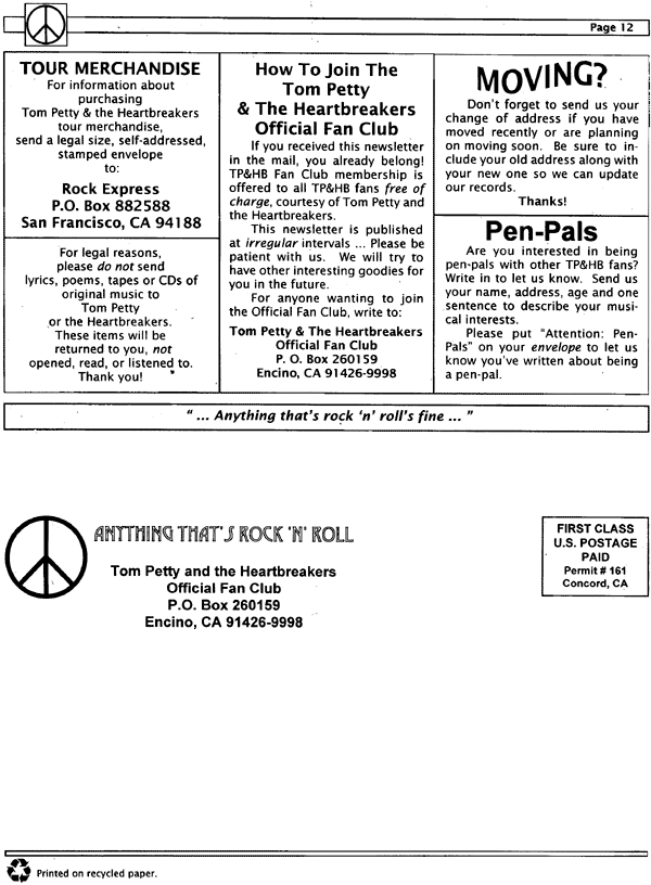 Thank you for all your great letters to Tom and the Heartbreakers. Keep writing -- They love to hear from you! And a special thanks to those of you who have written such kind words about the newsletter.